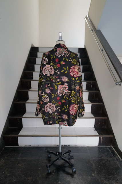 シルエットはモデル名にオーバーシャツが付いていますので少し大きめの作りですがそこは仕立ての良さからも嫌味も感じない。もう一方のモデルはミリタリベースのジャケット。シルク100%でアシンメトリーな花柄総刺繍、袖はお好みで調整可能にしてもらい、半袖、七部狙いの強者にも対応可能。こちらはどちらかとゆうと横に大きめのシルエット。裏なしで取り敢えず軽く涼しい。